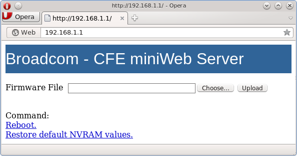 - Or upgrade the router with a new fake firmware (filled with zeroes). This will force CFE to stop for requesting a new firmware.