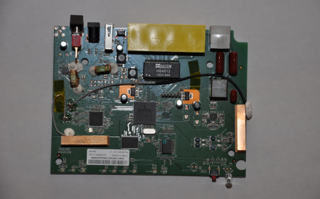 Next remove the four screws. Two of them were covered by the glossy plastic cap. The other two are under the rubber feet closest to the back (where the ethernet ports are). These feet are lightly glued on and can be peeled off with a flathead screwdriver. The other two rubber feet (near the front of the device) can stay attached.