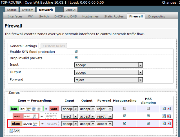 o) Go to Network / Firewall and add a new GLAN-Zone: