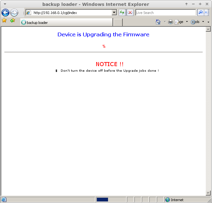 - Click [Update] and let router flash the image (don't worry if it reboots before it reaches 100%). The page should display “Device is Upgrading the Firmware” in blue letters with the current percentage in red (with an incompatible Browser it doesn't). Look at the screenshot at the end of this section.